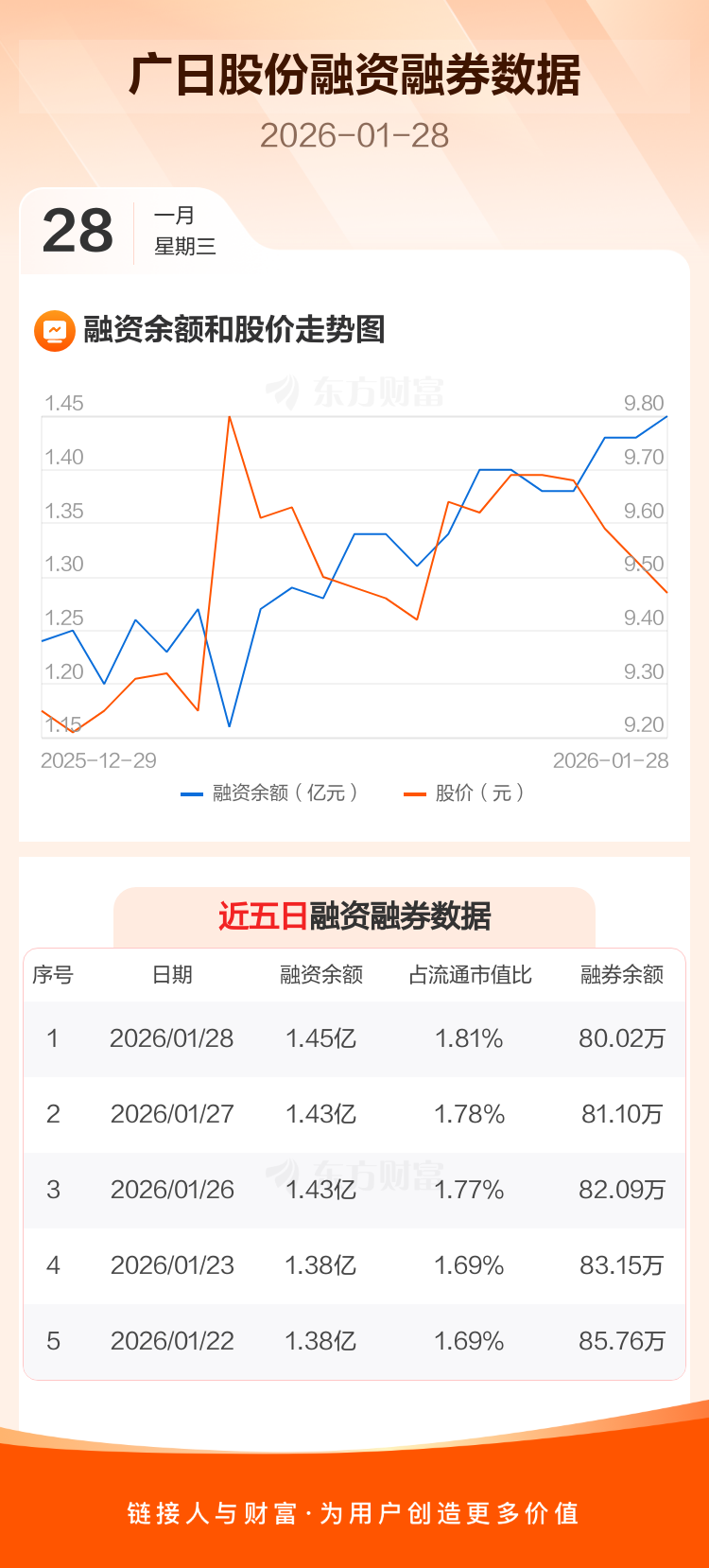 交易所最新数据显示,广日股份于2026年1月28日获融资买入409.75万元,融资偿还256.51万元,当日融资净买入153.24万元。目前,该股融资余额1.45亿,占流通市值比例为1.81%。