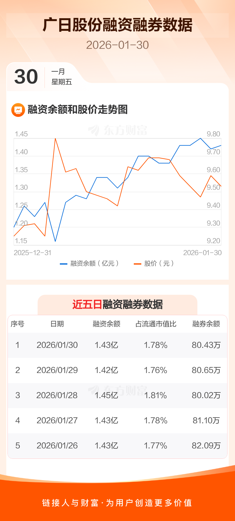交易所最新数据显示,广日股份于2026年1月30日获融资买入558.05万元,融资偿还509.11万元,当日融资净买入48.94万元。目前,该股融资余额1.43亿,占流通市值比例为1.78%。