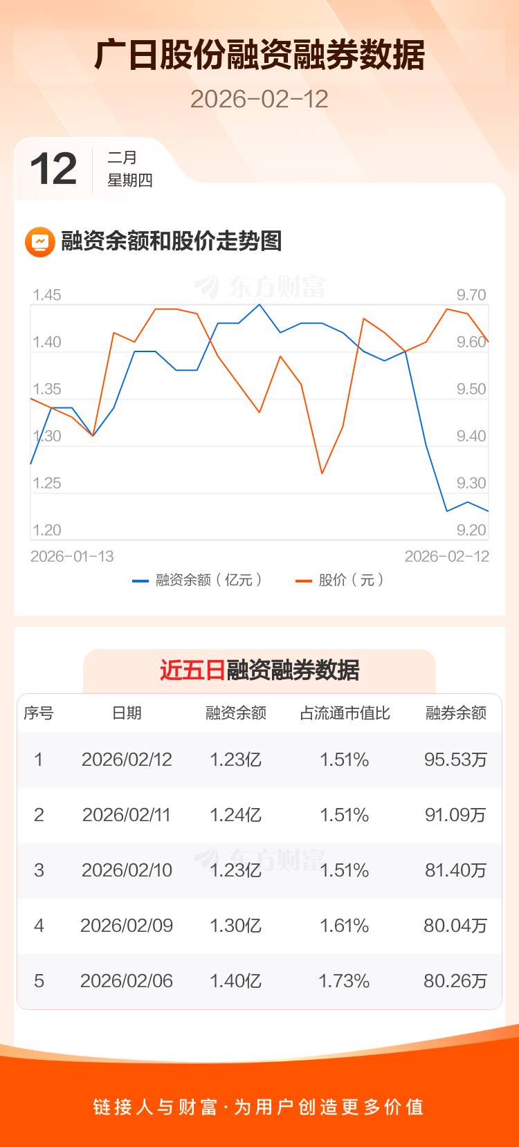 交易所最新数据显示,广日股份于2026年2月12日获融资买入178.22万元,融资偿还281.27万元,当日融资净偿还103.04万元。目前,该股融资余额1.23亿,占流通市值比例为1.51%。