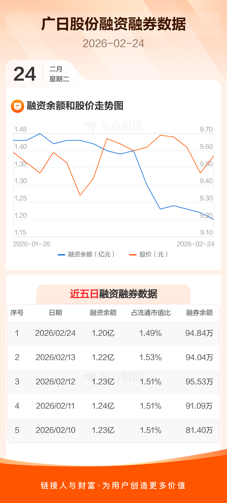 交易所最新数据显示,广日股份于2026年2月24日获融资买入193.51万元,融资偿还393.59万元,当日融资净偿还200.08万元。目前,该股融资余额1.20亿,占流通市值比例为1.49%。