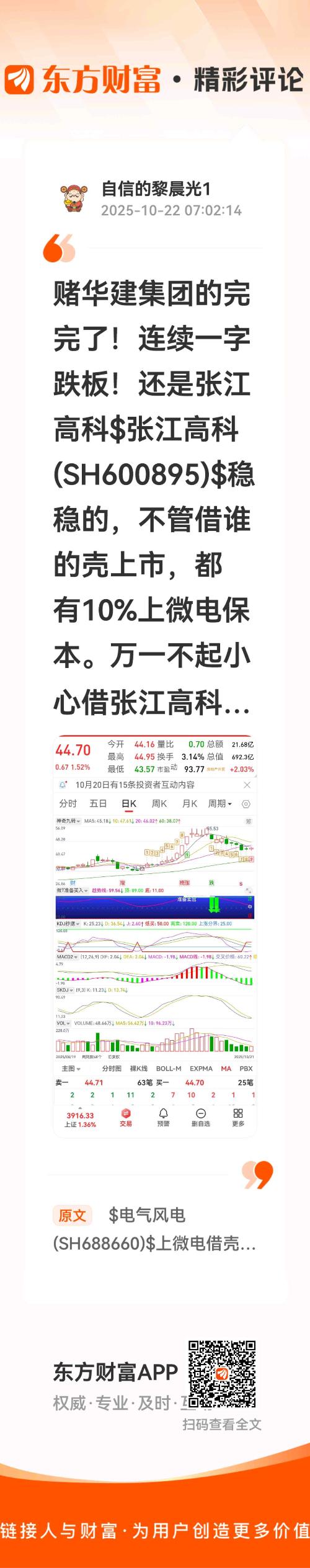 //@自信的黎晨光1 :赌华建集团的完完了!连续一字跌板!还是张江高科$张江高科(SH600895)$稳稳的,不管借谁的壳上市,都有10%上微电保本。万一不起小心借张江高科上市呢