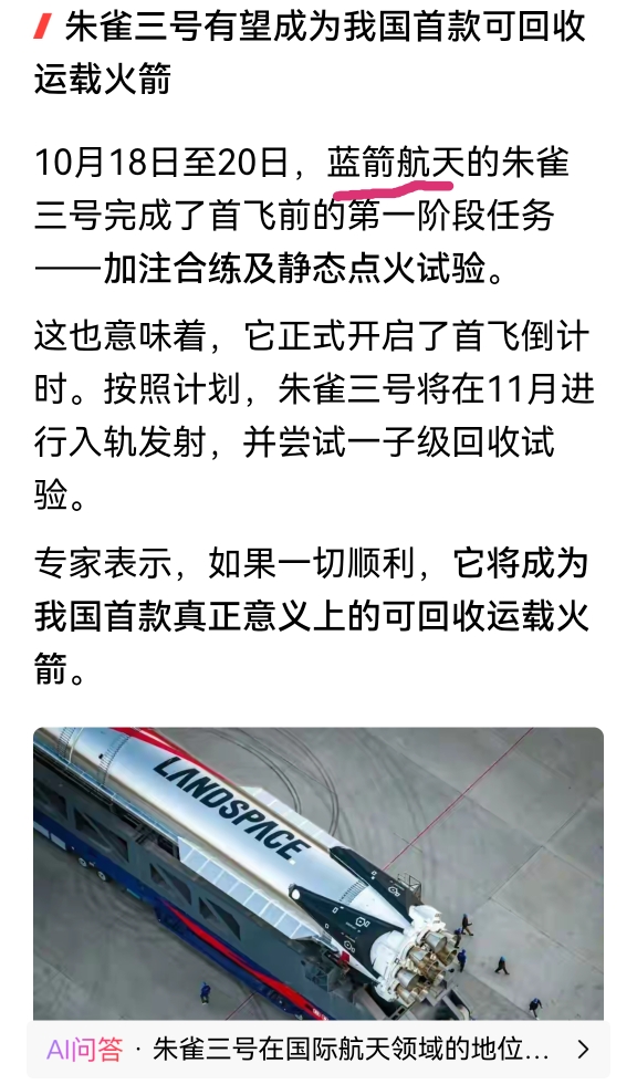 $张江高科(SH600895)$ 马斯特盛赞张江高科持股10%蓝箭航天的朱雀3可回收火箭