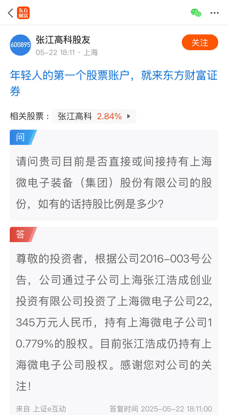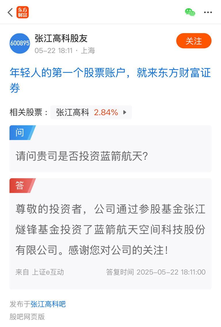 张江持股微电子装备10.779%,持股蓝箭航天10%,间接持股持股沐曦集成、摩尔线程、宇树科技等