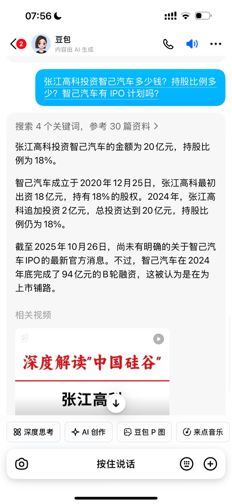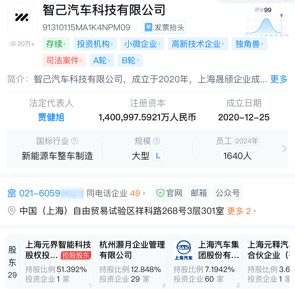 张江高科持股智己汽车18%,去年完成B轮融资,近期要上市,由上汽集团+阿里+张江