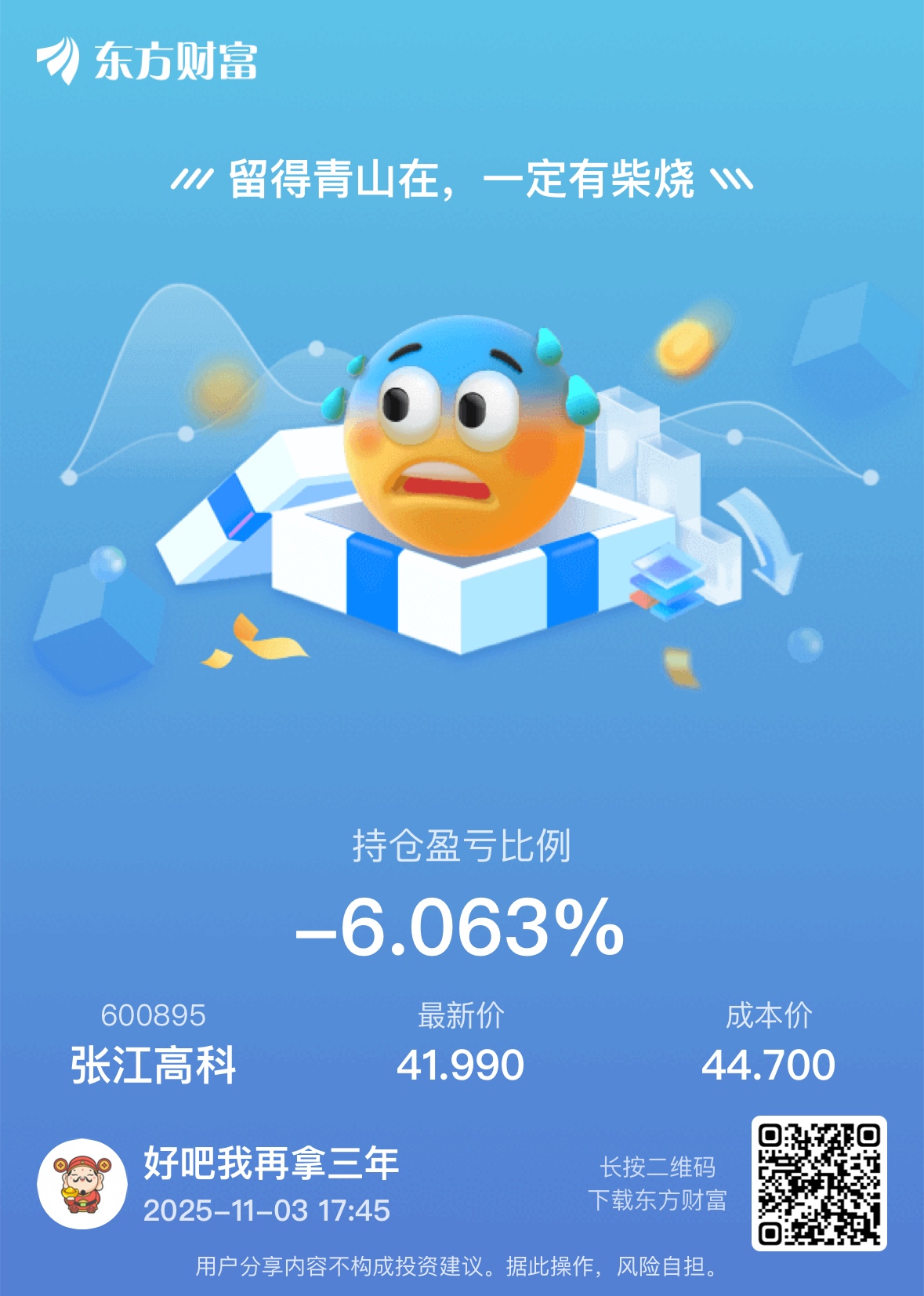 还得努力啊,52块本T到44,实在是买高了,莫得办法。