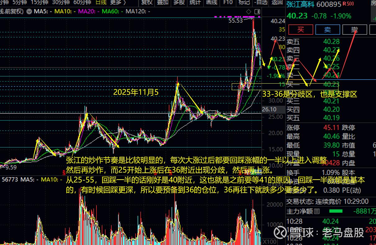 张江回踩到41附近还没止跌迹象,很多人估计有点慌了,之前说过到这个位置最多做5成,要预防到36的,或者留着右侧加。复盘一下就知道,$张江高科(SH600895)$ 前面几次炒作回踩力度都很多,回踩一半涨幅是常态了,所以做这一只翻炒机会是不缺的,仓位控制是关键
