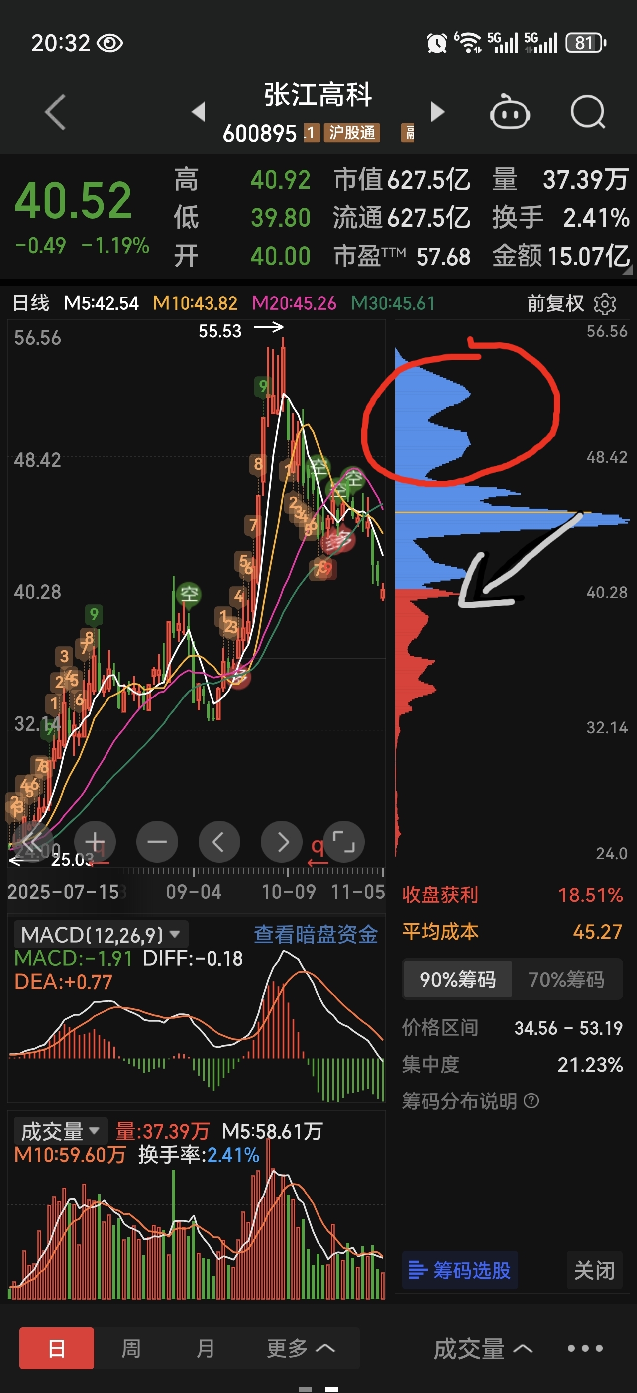 $张江高科(SH600895)$ 想要反转向上必须两个条件:1.红圈里面的接盘侠割肉割的差不多,筹码明显减少;2.筹码峰从现在的45降到40甚至以下,45的筹码明显减少。明年再看吧,这两个月继续在这是浪费时间。
