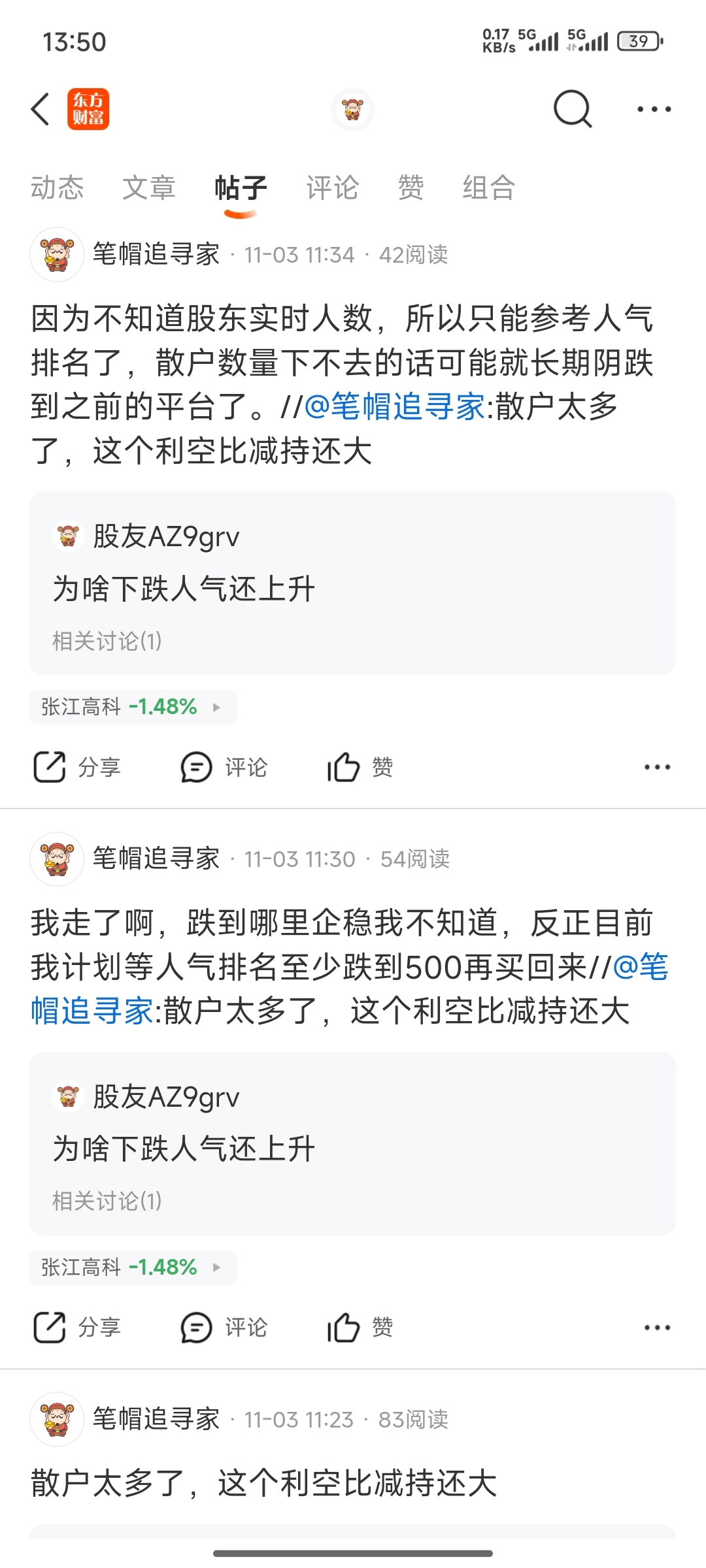 $张江高科(SH600895)$ 我就说要等时机再买,再说一遍减持已经不是最大的利空,散户数量大增才是最大的利空。你们看,这才几天又跌好多。目前人气排名四百多,之前计划跌到500再考虑买入,准备可以分批买入了,最迟月底就可以反弹。
