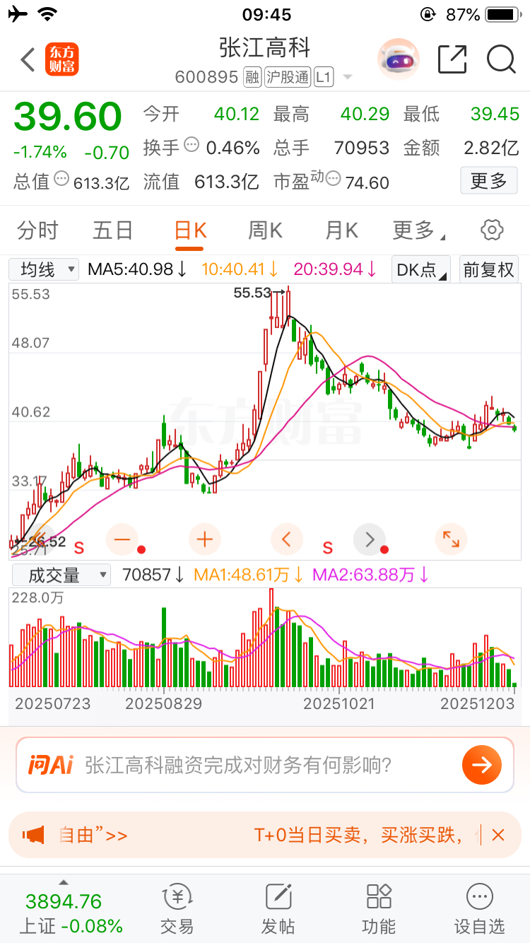 $张江高科(SH600895)$ 昨天买早了,今天破位再买差不多,大意了。