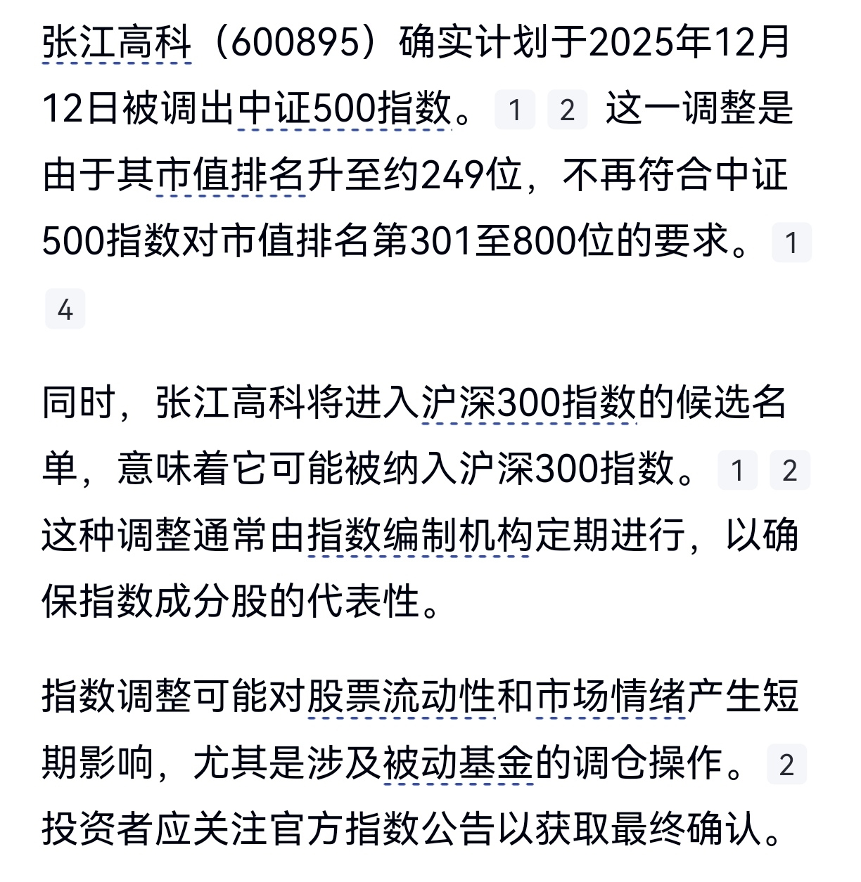 $张江高科(SH600895)$ 所有人,听好了,不要再问了,今天张江高科被移出中证500指数,被纳入沪深300指数。今天还在高点卖出嘲笑别人接盘的,后面你们会拍断大腿追进来来接我我们的盘的。请看下面公告。