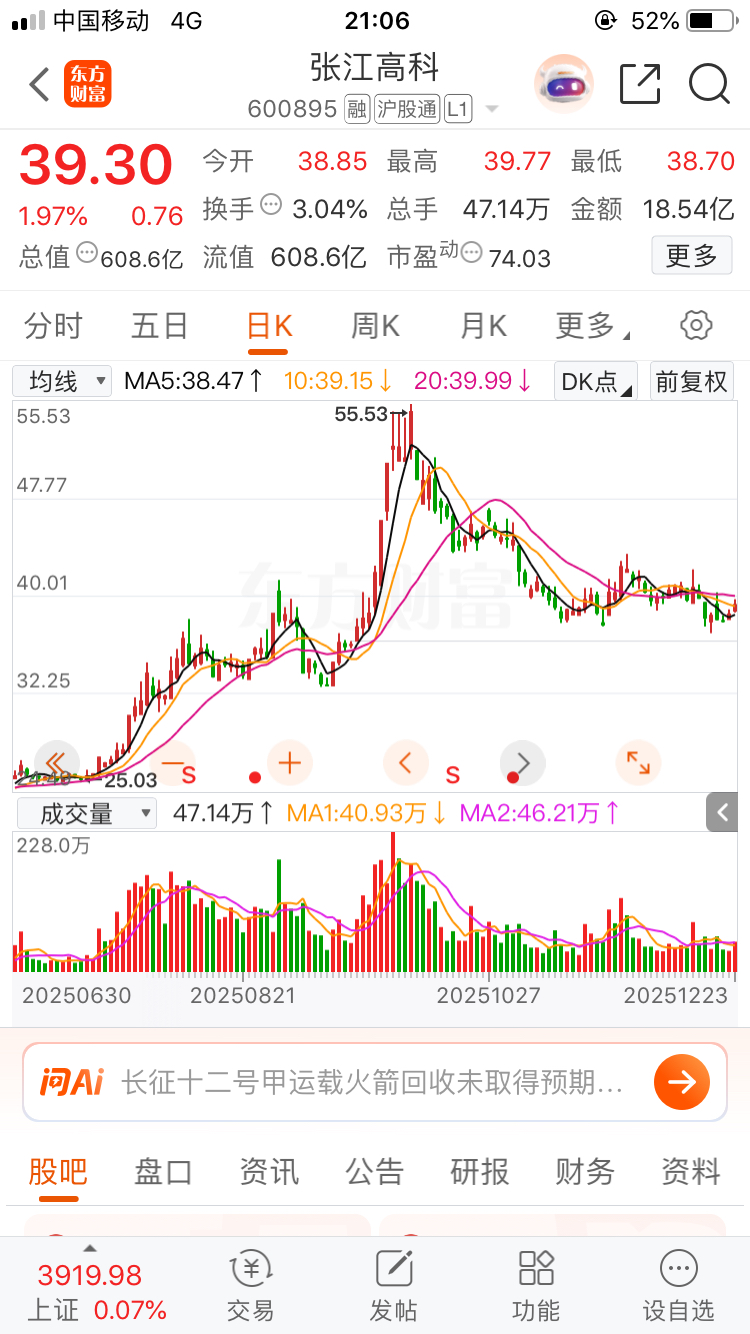 $张江高科(SH600895)$ 之所以涨得弱,是因为张江高科它不大跌,喊了半个月到35元,扭扭捏捏不想跌,不跌就没有上涨空间,也没有买入的冲动,大家看月线,吊在半空,谁买就套谁,38元 假装在止跌,其实就是单边下跌的中继,震荡下行罢了。特别提示:20日均线乃生命线,只要一天不站上,就坚持看空。朋友们,点个小赞赞呗,马上突破一万个赞