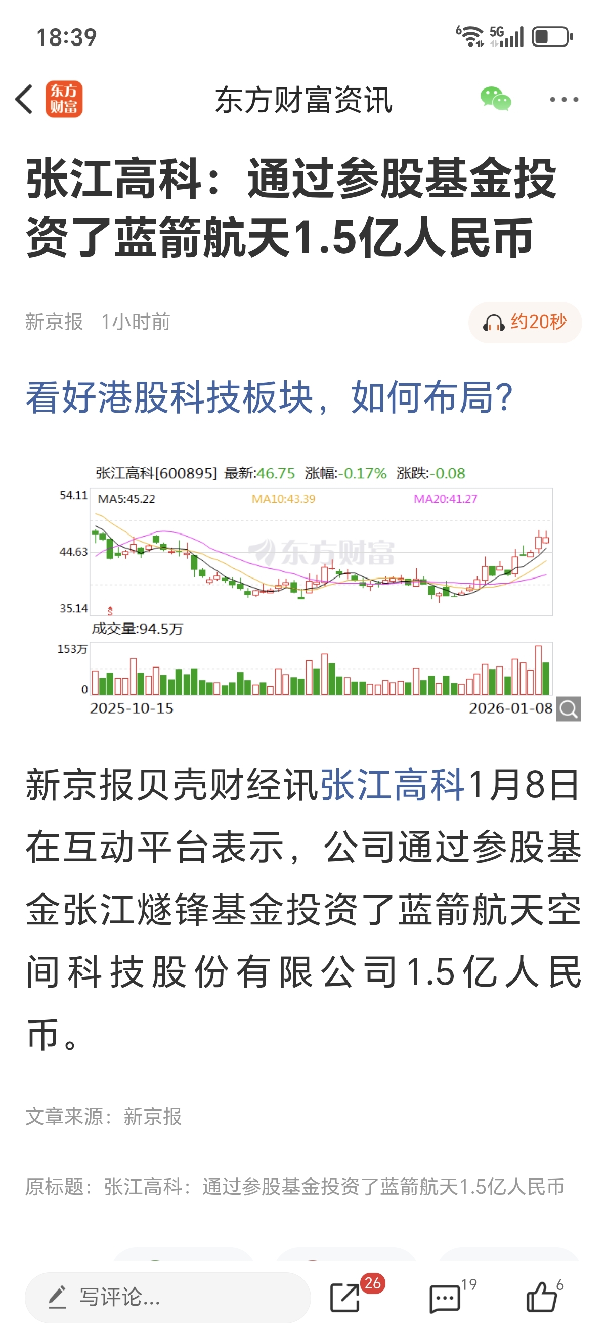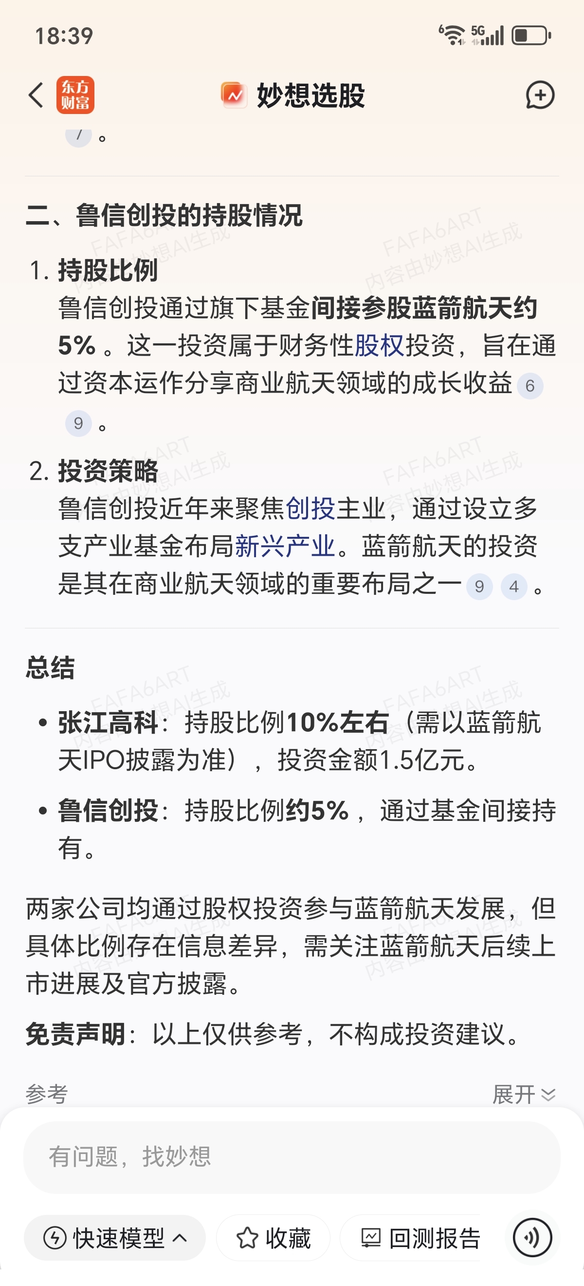 张江高科投资蓝箭航空1.5亿,折合持股10%,鲁信创投持股5%,鲁信创投6个板,