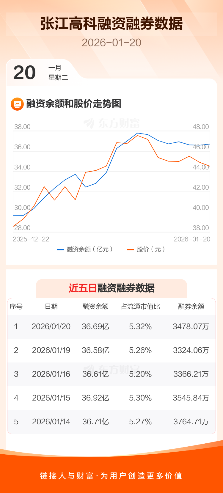 交易所最新数据显示,张江高科于2026年1月20日获融资买入2.44亿元,融资偿还2.33亿元,当日融资净买入1099.36万元。目前,该股融资余额36.69亿,占流通市值比例为5.32%。