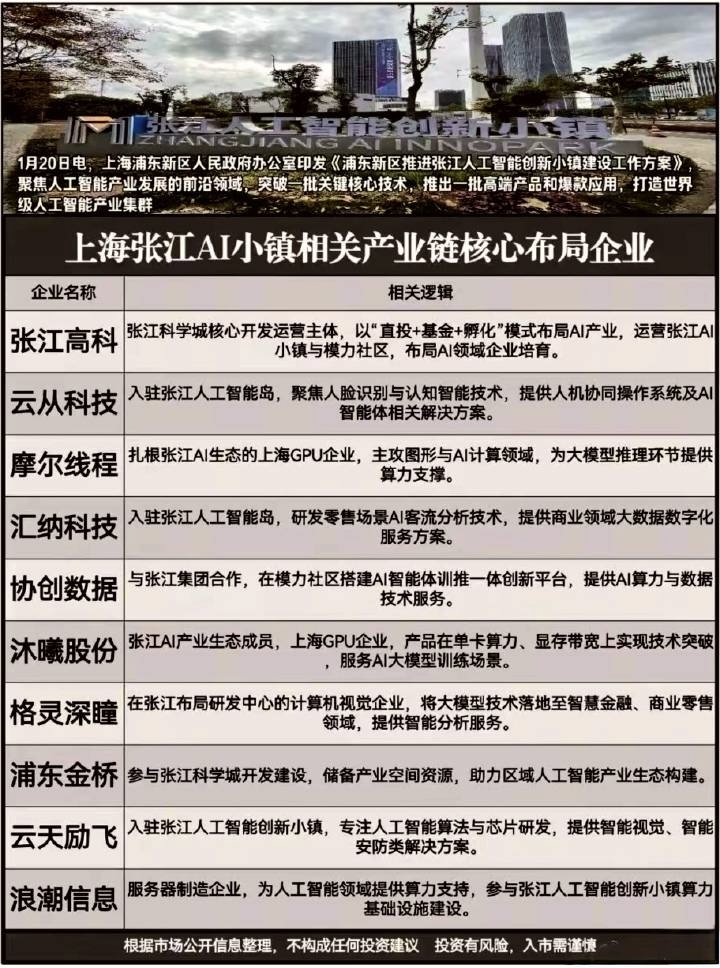 新题材:上海张江AI小镇概念1月20日,浦东新区印发张江人工智能创新小镇建设方案,剑指世界级AI产业集群。