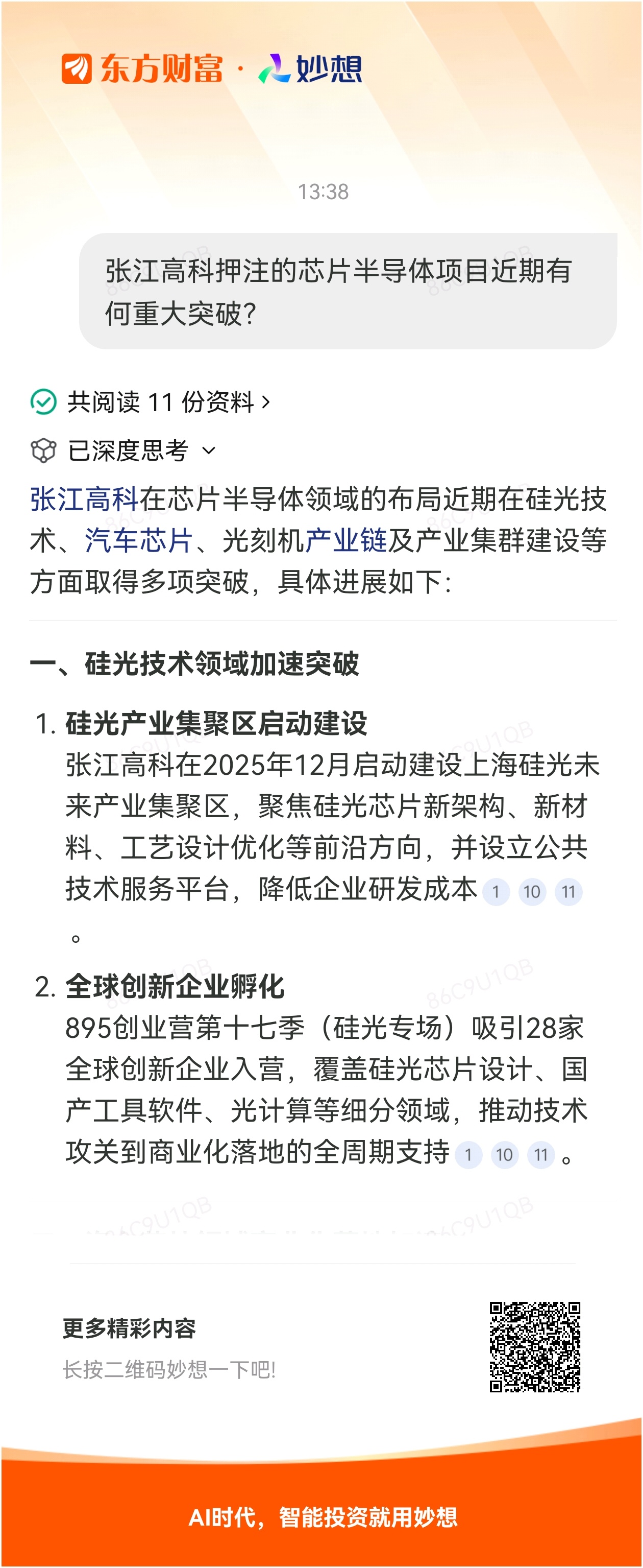 #@妙想,你怎么看?# 妙想一下:张江高科押注的芯片半导体项目近期有何重大突破?