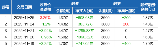 融资方面,当日融资买入1079.73万元,融资偿还1688.41万元,融资净偿还608.68万元,连续5日净偿还累计4085.6万元。融券方面,融券卖出0股,融券偿还200股,融券余量3600股,融券余额5.82万元。融资融券余额合计1.37亿元。