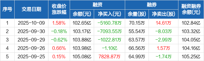 融资方面,当日融资买入1.79亿元,融资偿还2.31亿元,融资净偿还5160.78万元,连续4日净偿还累计2.43亿元。融券方面,融券卖出15.66万股,融券偿还1.05万股,融券余量70.15万股,融券余额1941.75万元。融资融券余额合计102.84亿元。