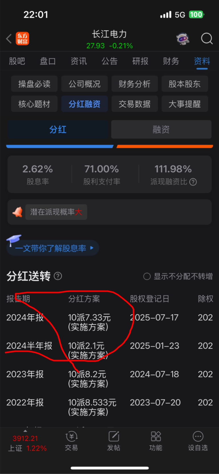 $长江电力(SH600900)$ 闲的没事翻了下长电的股息率只有2.62,总觉得不对劲,自己一算,