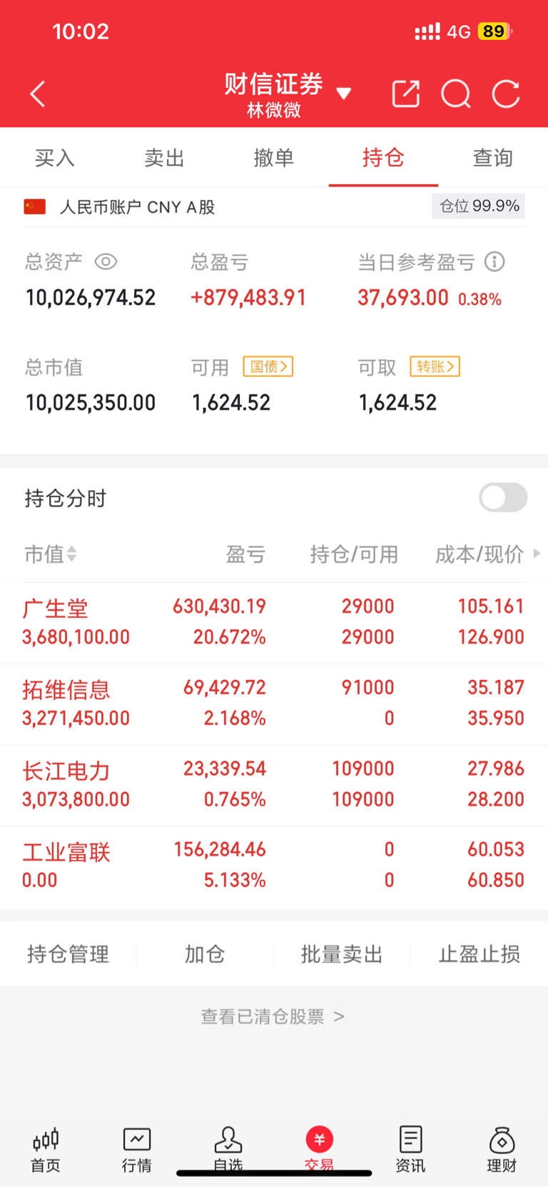 继续持有 $长江电力(SH600900)$ $广生堂(SZ300436)$ 这两支具备增长潜力,我满怀期待,相信随着后续市场的发展,达成盈利目标。