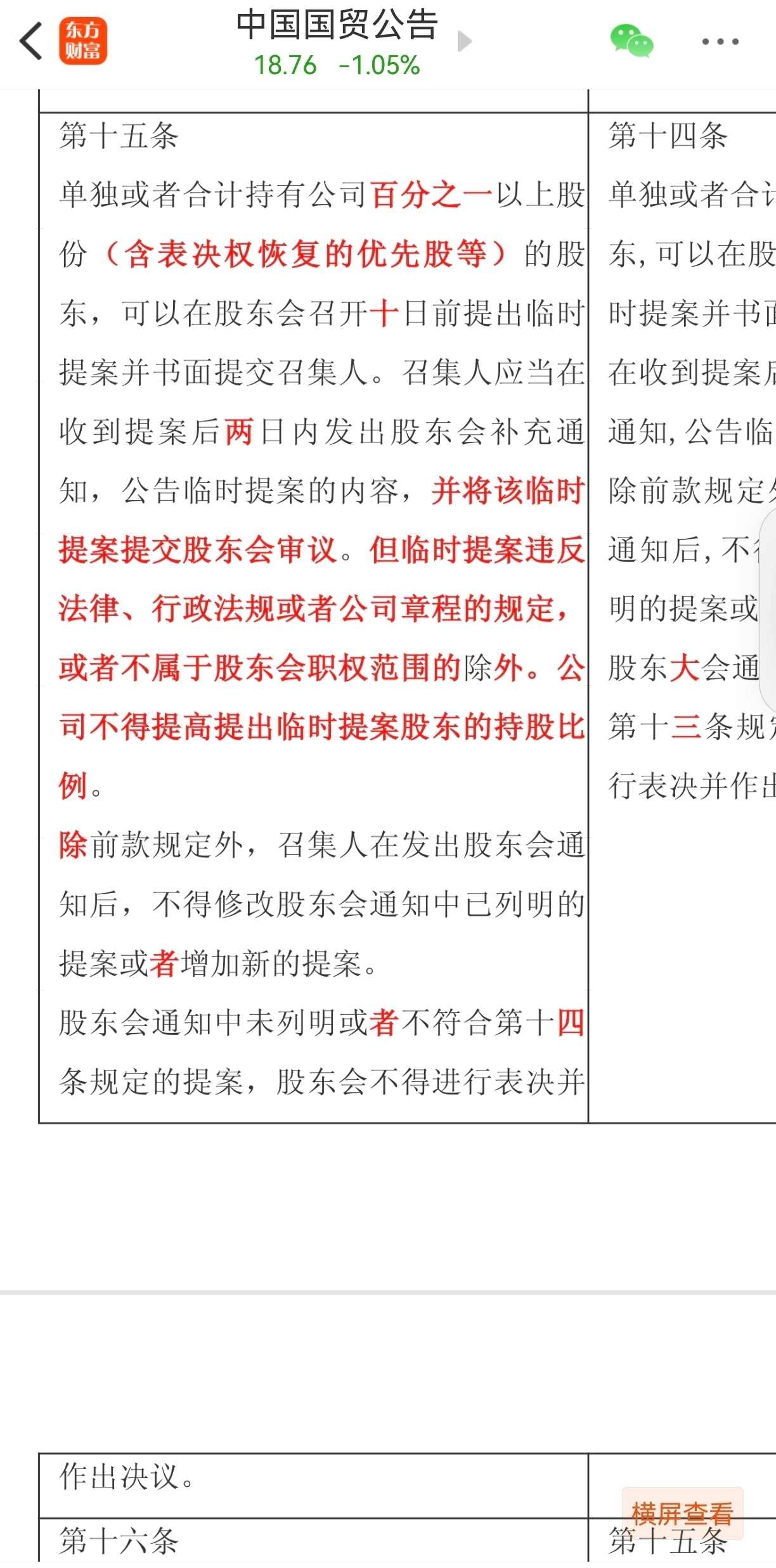 中国国贸仅1.95亿流通股将越来越珍贵,单独或合计持公司股份的1%即1000万股即可提䅁股东大会表决,十大个人股东加关联帐户几乎人人都享有股东大会提案权,原来可要3%即3000万股才有权提案几乎没有任何人有权,这下参与股东大会提案门坎降低太多了,流通股争夺战即将打响!