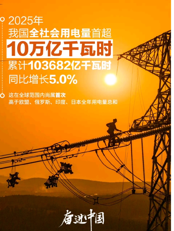 $长江电力(SH600900)$ 奋进中国#【#2025我国用电量有了历史性突破#】2025年,我国全社会用电量首超10万亿千瓦时,累计103682亿千瓦时,同比增长5.0%。这在全球范围内尚属首次,高于欧盟、俄罗斯、印度、日本全年用电量总和。#中国又创下一项全球首次!