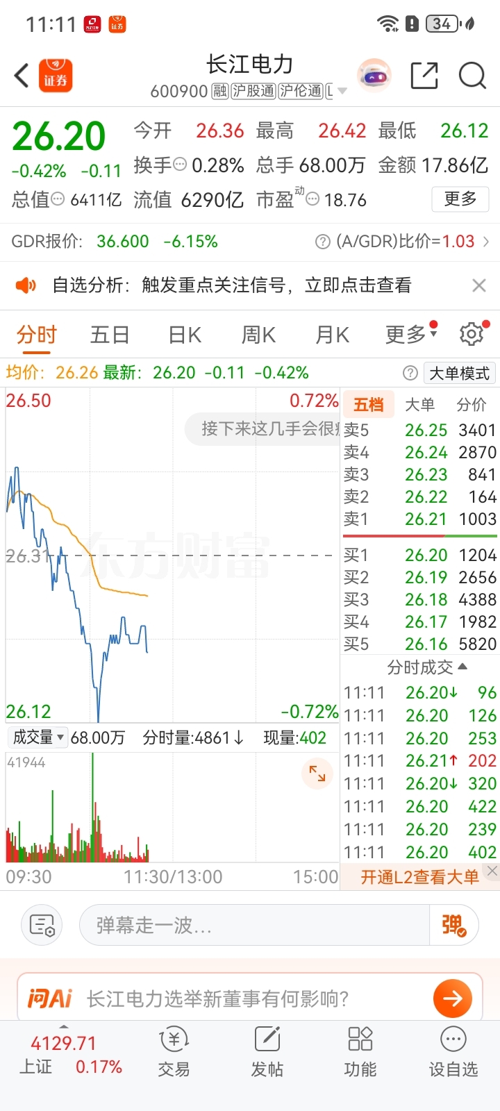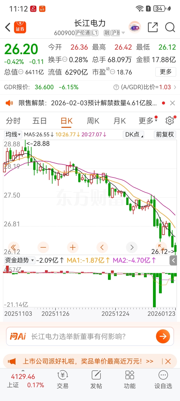 $长江电力(SH600900)$ 个人观点而已。大机构对倒建仓,成交量巨大!有79亿元多反复几次巨量成交。个人认为就是底部区间。向下空间很少!大家不要傻瓜瓜的丢掉宝贵的筹码了!最多破26元不破不立嘛。哈哈哈哈余下就是买便宜货的时机。我反正是有钱就买。一股不卖!有不服的吗出来走走。哈哈哈这么便宜的价格!蛮蛮难看到了。至于说新董事长的面子工程!266亿元。都是8年以后的事情了!可以不理会!最后大家担心那个解禁股票都是大股东和云川公司和川云公司!不会减持的。无需理会。