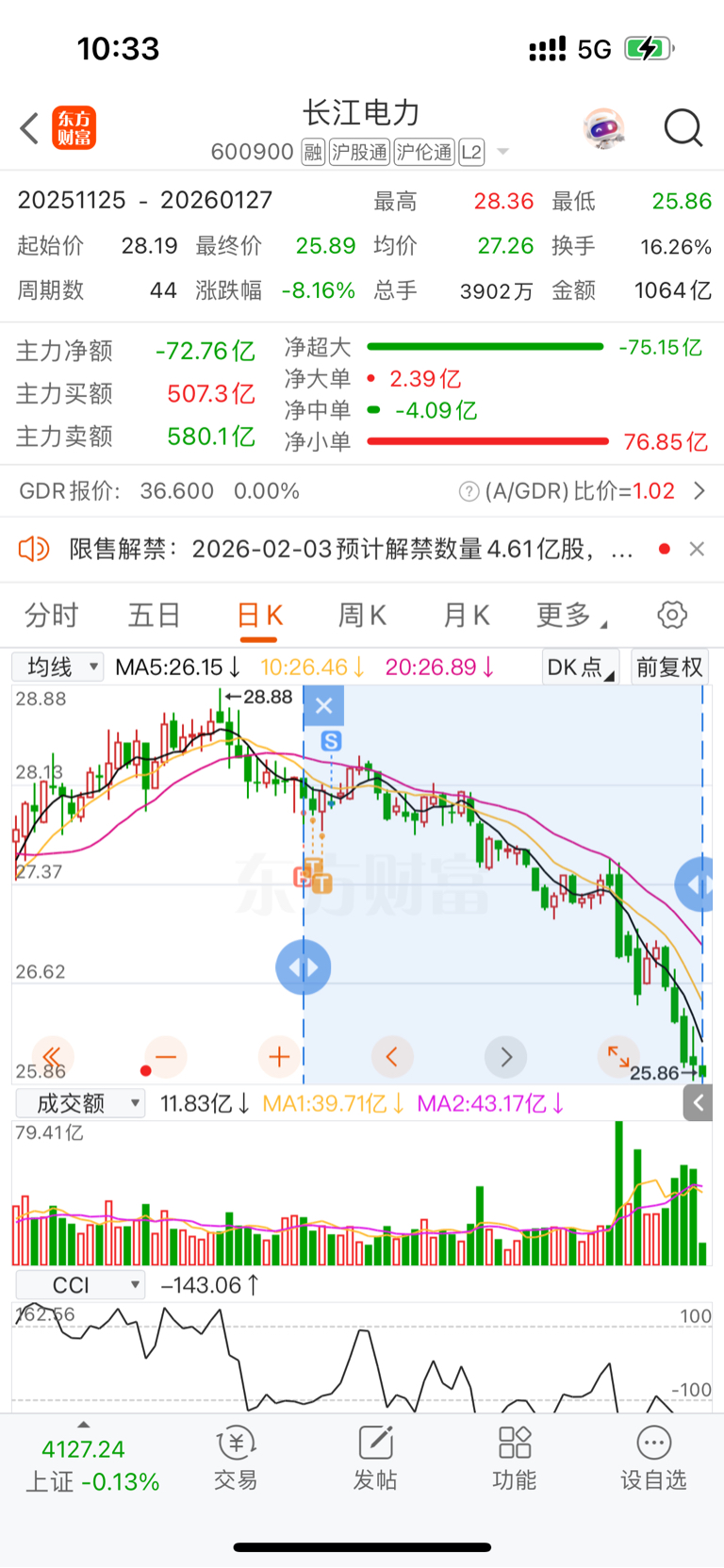 $长江电力(SH600900)$ 你是一点都不稳啊