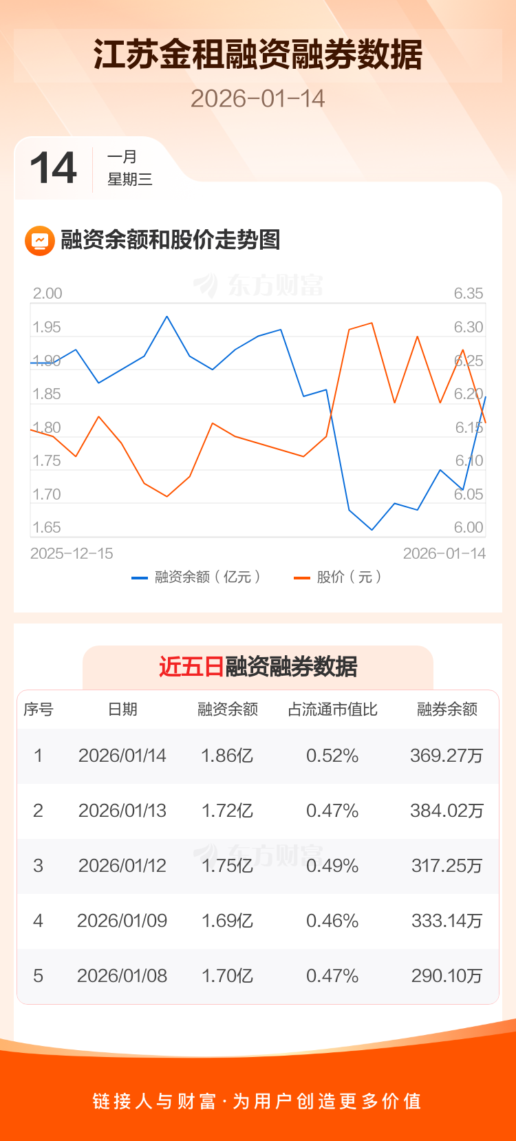 交易所最新数据显示,江苏金租于2026年1月14日获融资买入3181.97万元,融资偿还1780.24万元,当日融资净买入1401.73万元。目前,该股融资余额1.86亿,占流通市值比例为0.52%。