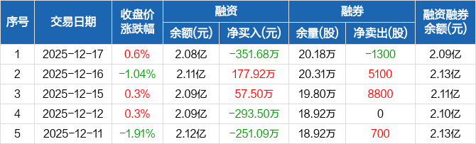 贵州燃气:融资净偿还351.68万元,融资余额2.08亿元(12-17)