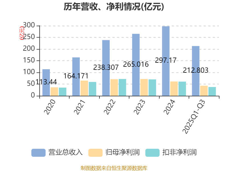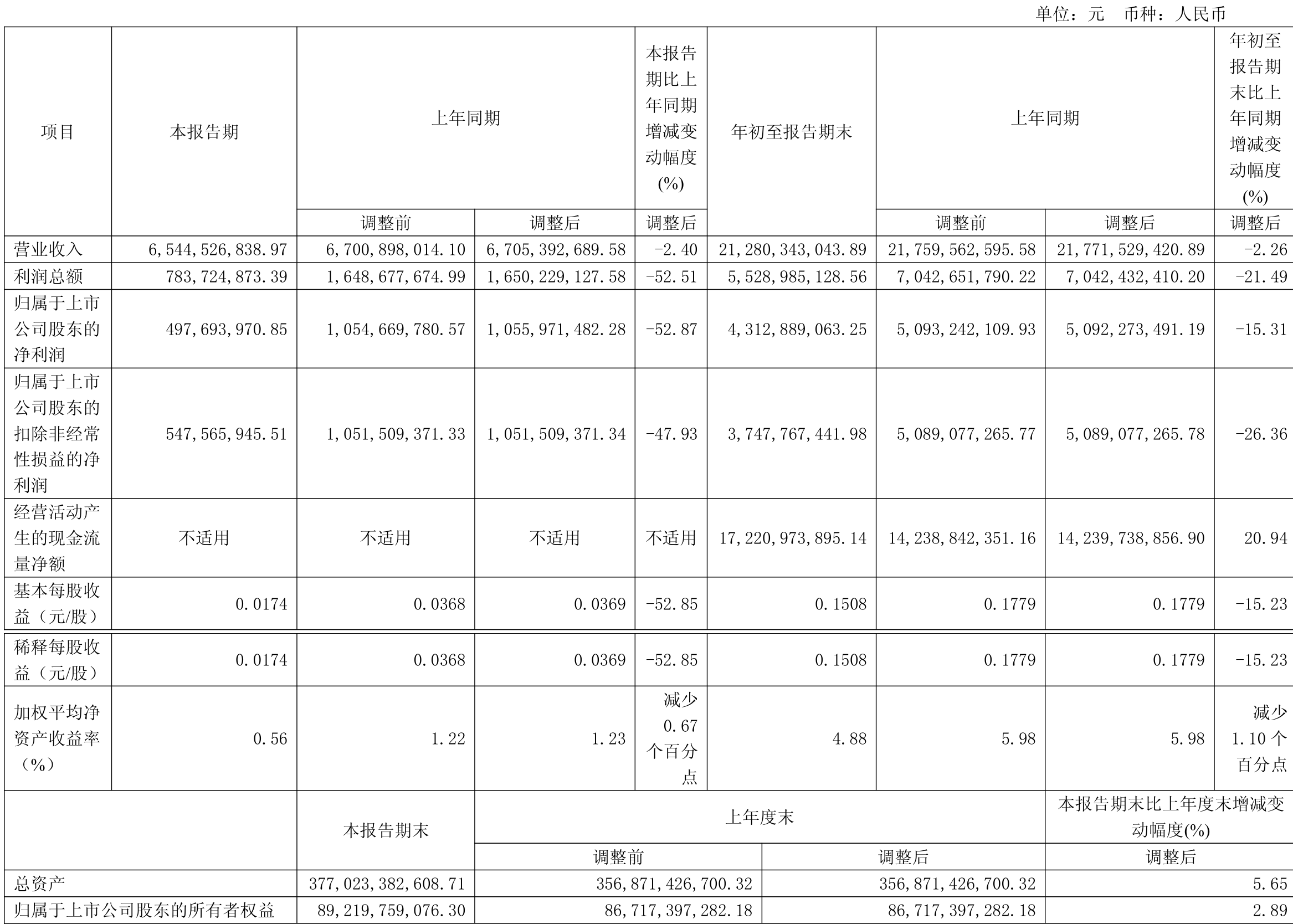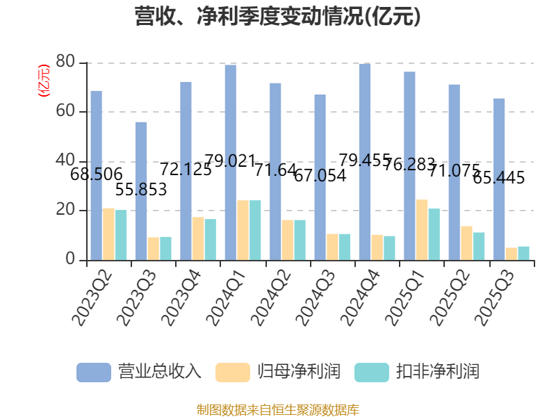 2025年前三季度,公司经营活动现金流净额为172.21亿元,同比增长20.94%;筹资活动现金流净额40.39亿元,同比减少64.96亿元;投资活动现金流净额-199.84亿元,上年同期为-208.46亿元。