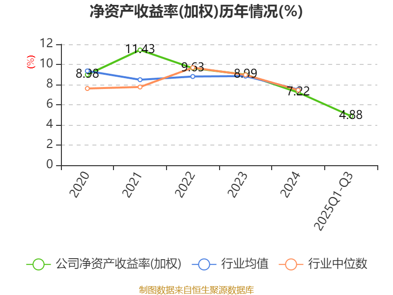 盈利能力方面, 2025年前三季度公司加权平均净资产收益率为4.88%,同比下降1.1个百分点。公司2025年前三季度投入资本回报率为2.47%,较上年同期下降0.89个百分点。
