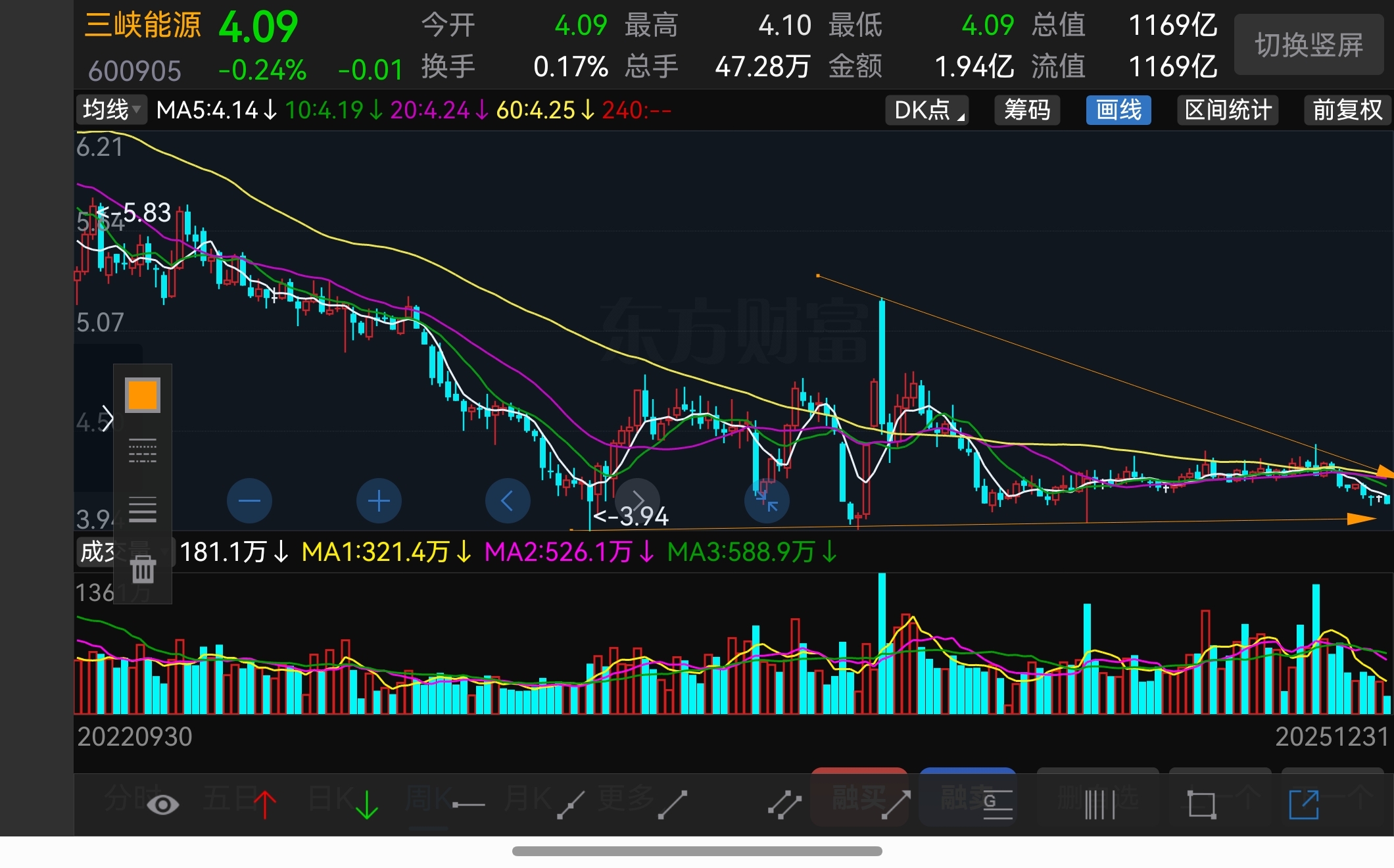 $三峡能源(SH600905)$ 划线来了。周K,收敛三角形。如果窄幅震荡,最慢最慢10周内就要突破三角形范围,也就是要选择方向了(有个评论说70天,基本吻合)。如果快,涨5%或者跌2%,就突破了三角形范围,提前选择方向。划线只是参考,不可依此操作,切记!