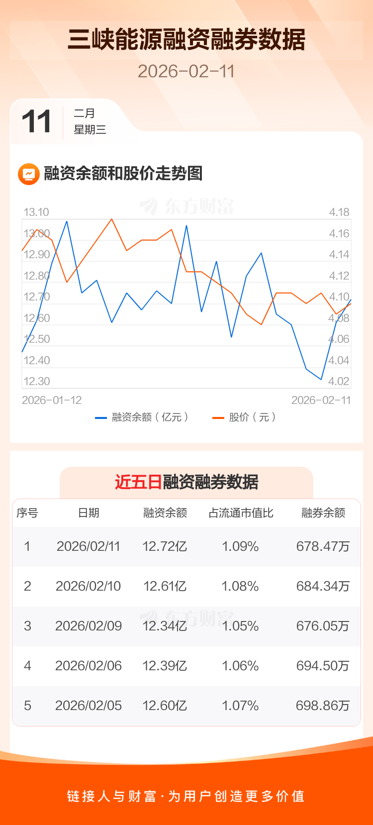 交易所最新数据显示,三峡能源于2026年2月11日获融资买入4528.95万元,融资偿还3458.67万元,当日融资净买入1070.28万元。目前,该股融资余额12.72亿,占流通市值比例为1.09%。
