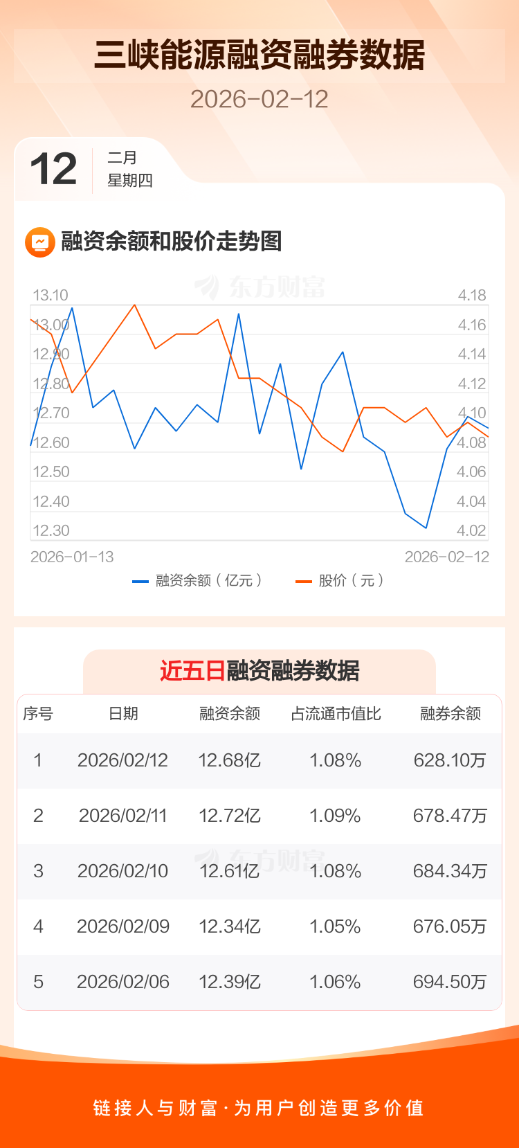 交易所最新数据显示,三峡能源于2026年2月12日获融资买入9920.34万元,融资偿还1.03亿元,当日融资净偿还422.19万元。目前,该股融资余额12.68亿,占流通市值比例为1.08%。