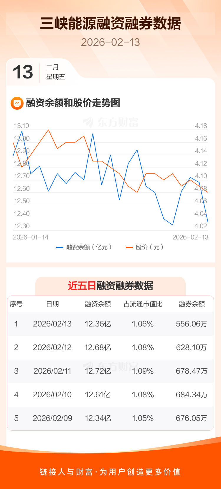 交易所最新数据显示,三峡能源于2026年2月13日获融资买入2184.24万元,融资偿还5347.20万元,当日融资净偿还3162.96万元。目前,该股融资余额12.36亿,占流通市值比例为1.06%。
