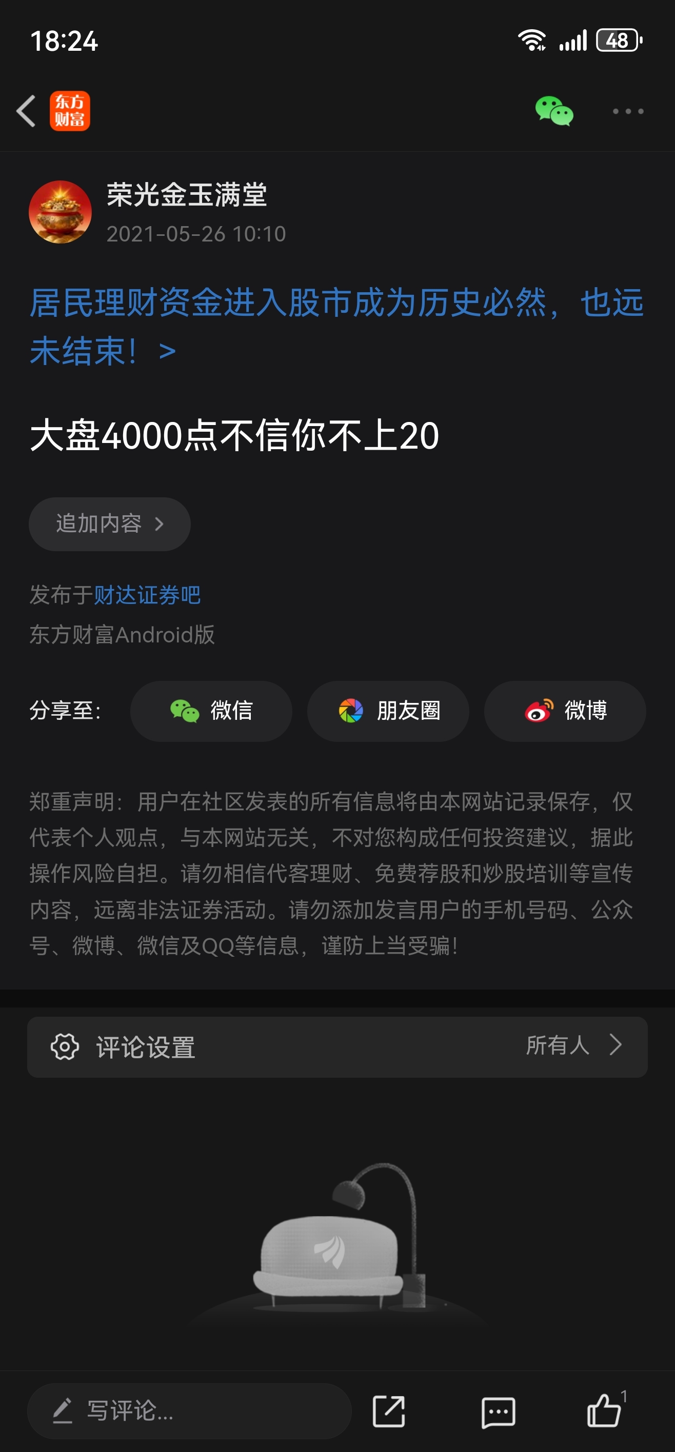 温馨提示: 1.根据《证券法》规定,禁止编造、传播虚假信息或者误导性信息,扰乱证券市场;2.用户在本社区发表的所有资料、言论等仅代表个人观点,与本网站立场无关,不对您构成任何投资建议。用户应基于自己的独立判断,自行决定证券投资并承担相应风险。《东方财富社区管理规定》