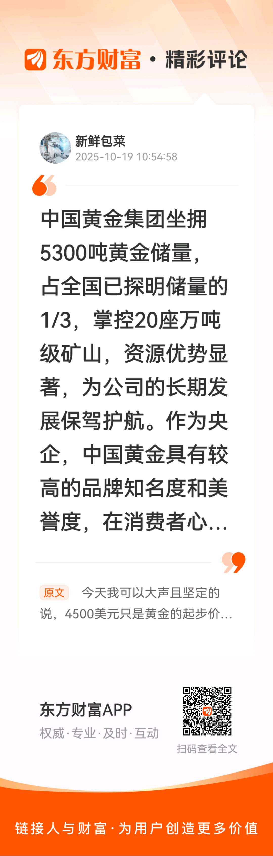 //@新鲜包菜 : 公司向好基本面没有改变:中国黄金集团坐拥5300吨黄金储量,占全国已探明储量的1/3,掌控20座万吨级矿山,资源优势显著,为公司的长期发展保驾护航。作为央企,中国黄金具有较高的品牌知名度和美誉度,在消费者心中享有较高的信任度。其与故宫、敦煌等合作推出的文创产品,如三星堆联名款“黄金面具”等,深受市场欢迎,进一步提升了品牌的影响力。全球央行持续购金,9月末中国央行黄金储备为7406万盎司,环比增加4万盎司,为连续第11个月增持。同时,美联储降息周期已然开启,投资端需求结构升级,黄金ETF与实物金条销量大增,这些因素都为黄金行业的发展提供了有利的环境。