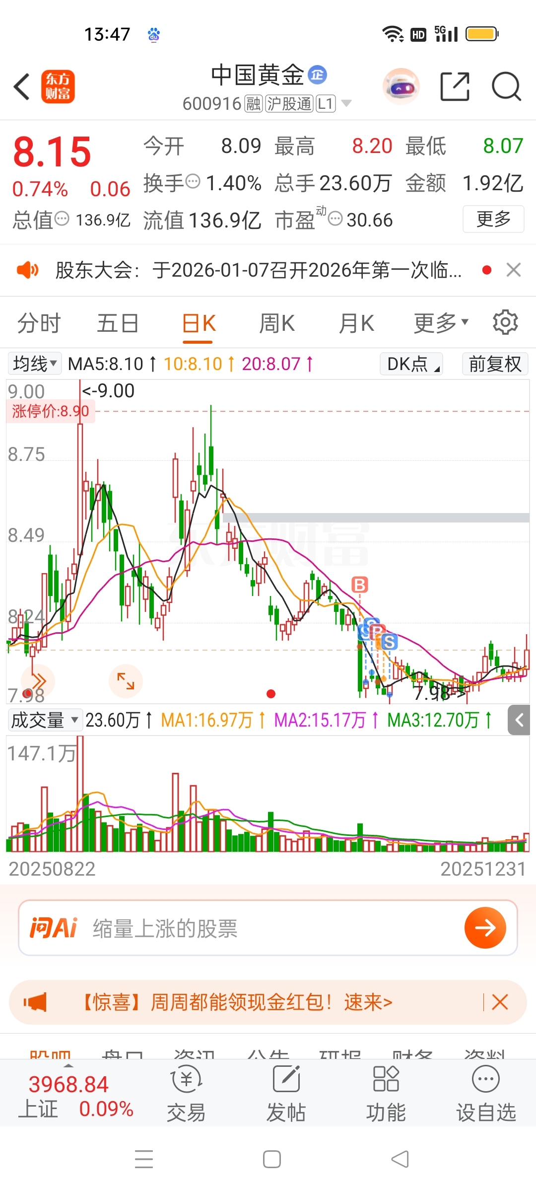 $中国黄金(SH600916)$ 我8.01卖的,抄底洋河,亏死了。如果我不走,这股绝对跌到7元。