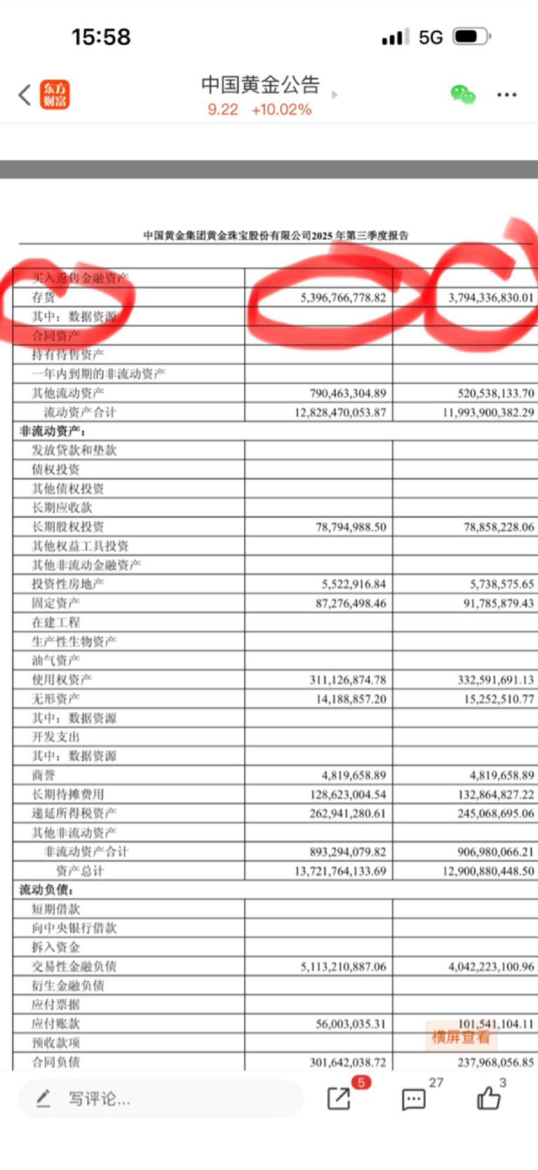 $中国黄金(SH600916)$ 三季度存货53.97亿比二季度存货多了16亿吗?光这些存货都发了