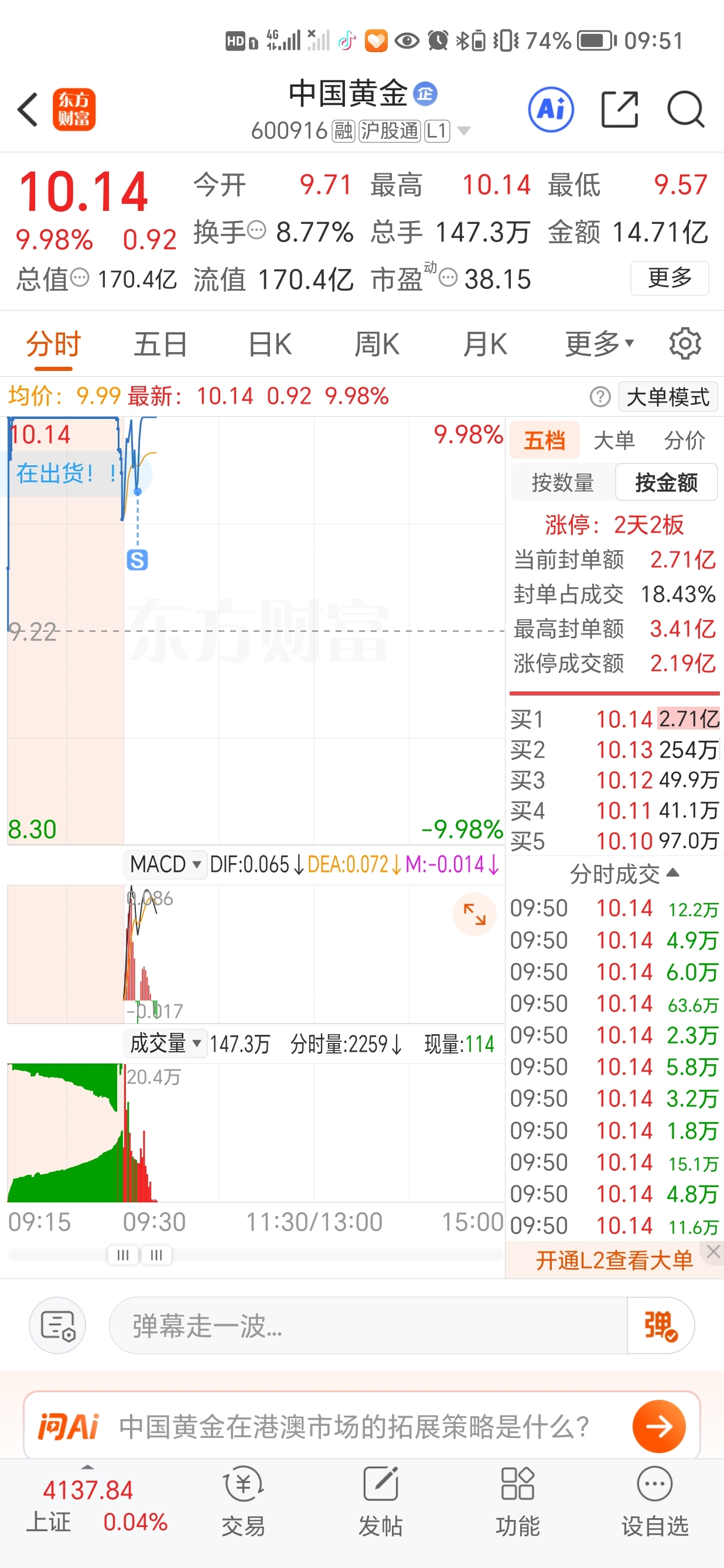 $中国黄金(SH600916)$ 气啊被洗下车了,,还就等我交筹码啊,看明天了