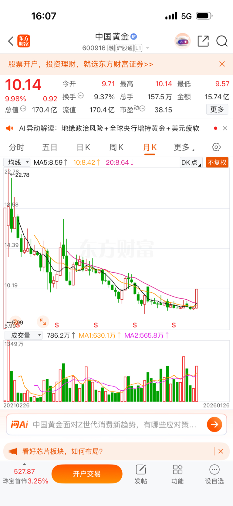$中国黄金(SH600916)$ 月线还是在低位
