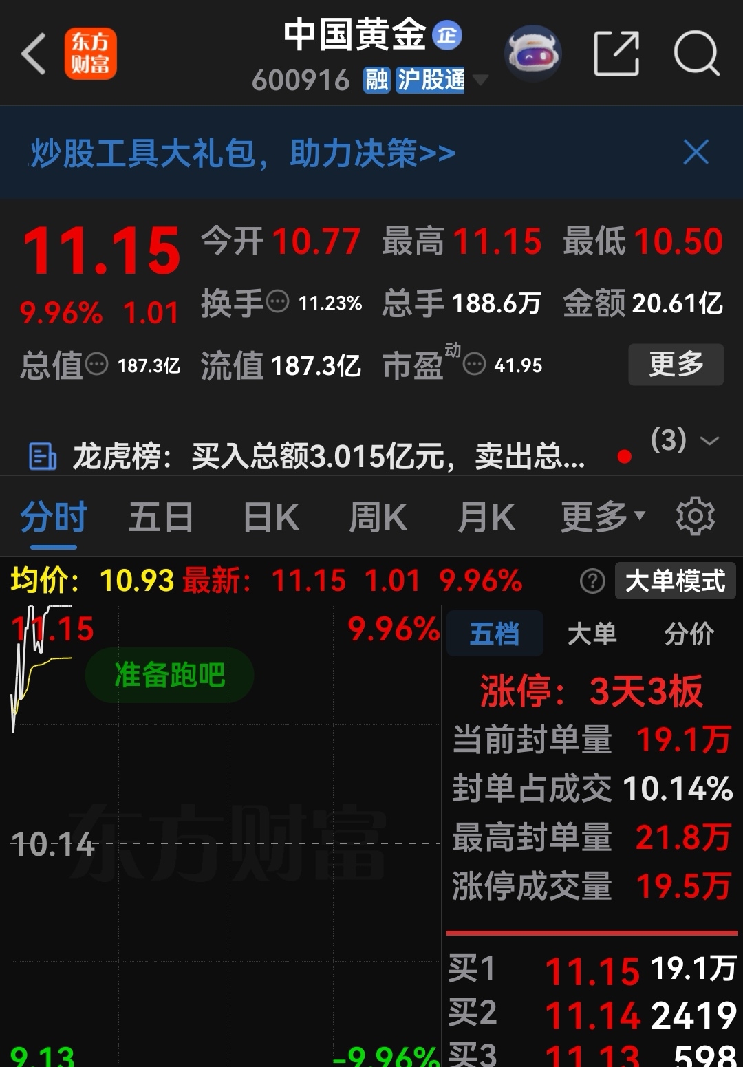 继续以涨停板11.15挂单减仓卖出中国黄金,居然又是一个涨停板,虽然几度开板当下
