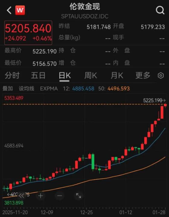 现货黄金突破5200美元/盎司大关后,盘中再度突破5220美元/盎司关口,现报5205.84美元/盎司。
