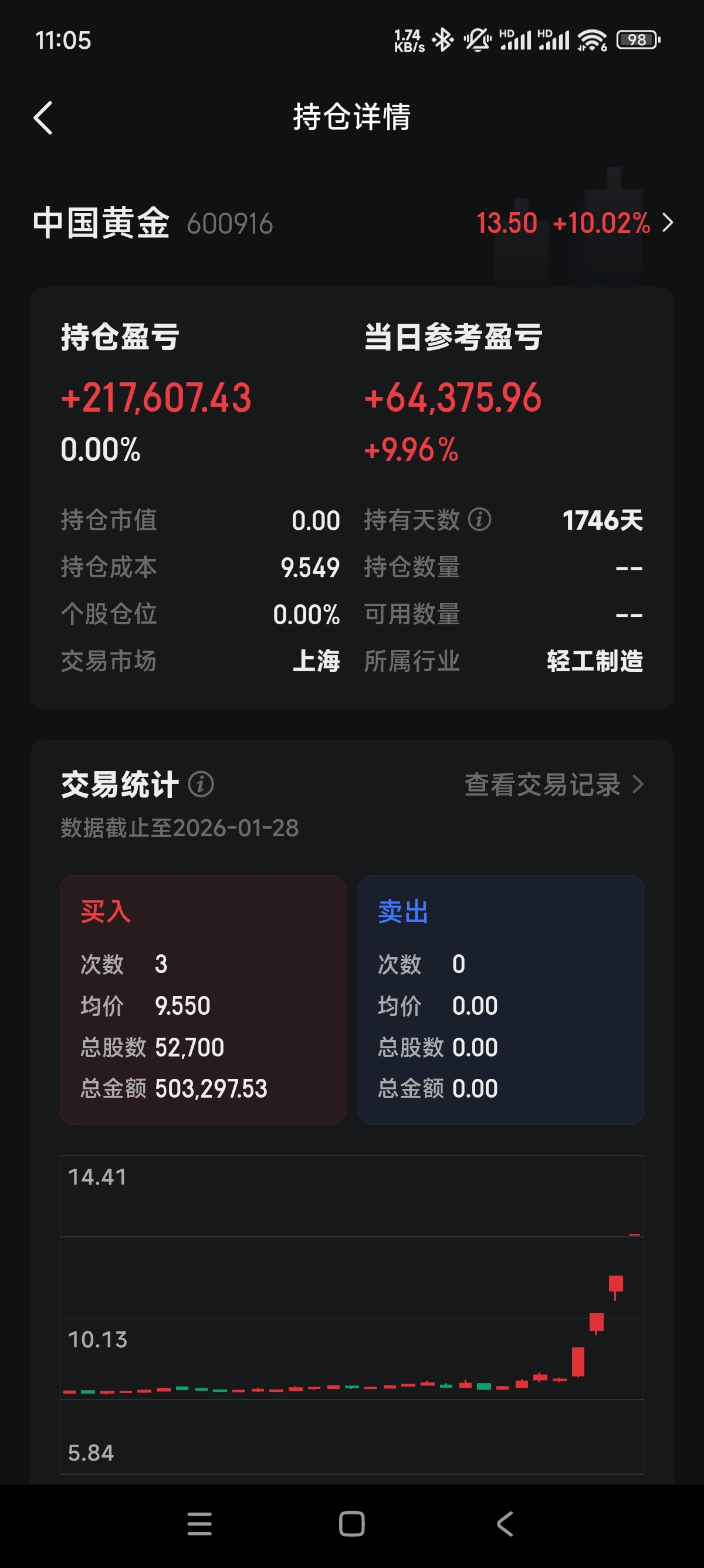 $中国黄金(SH600916)$ 五年了,太累了,走了