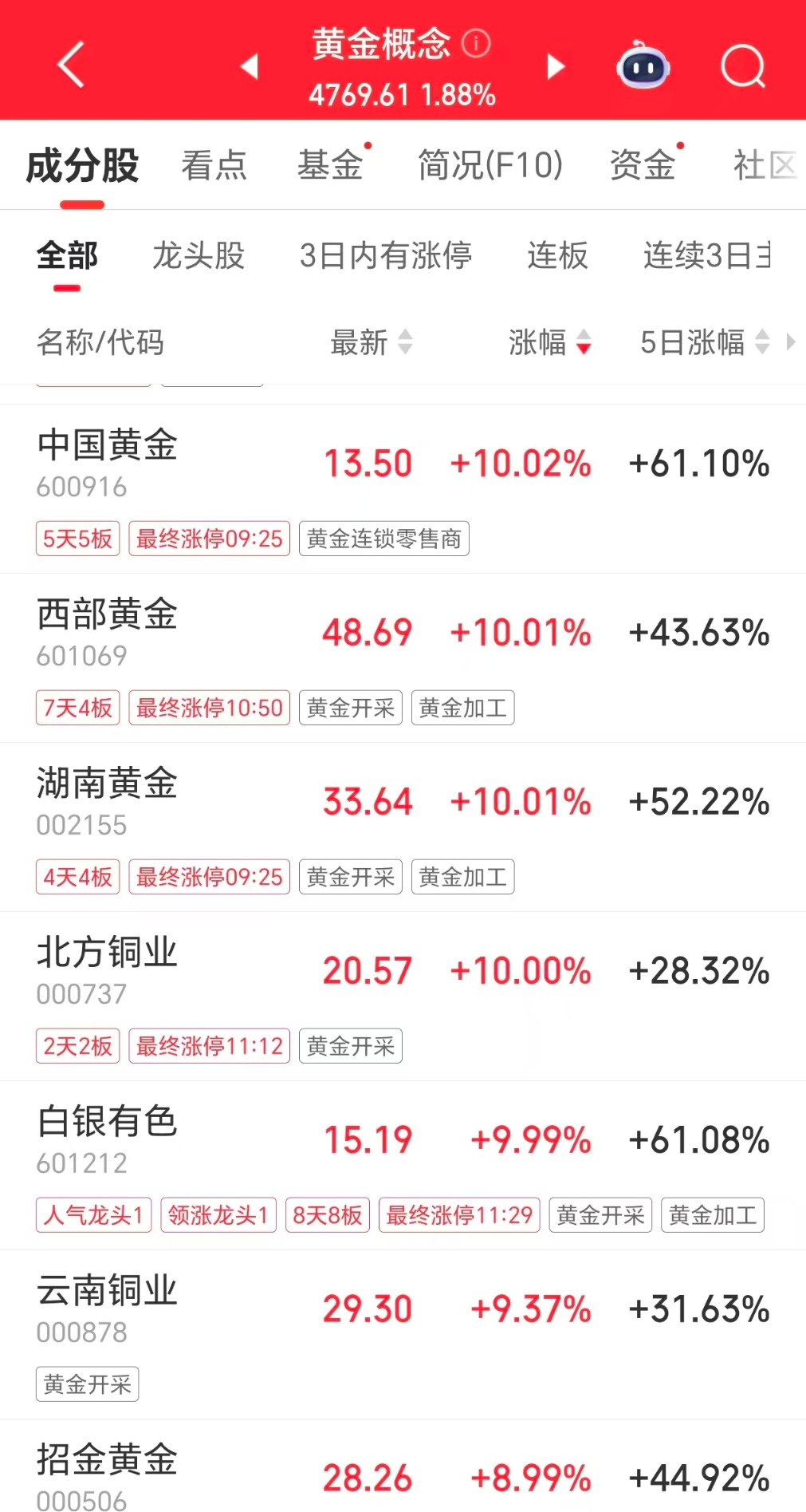 A股黄金概念股继续大涨。截至1月29日上午收盘,中国黄金、西部黄金、湖南黄金、北方铜业、白银有色等涨停,云南铜业、招金黄金等大涨。