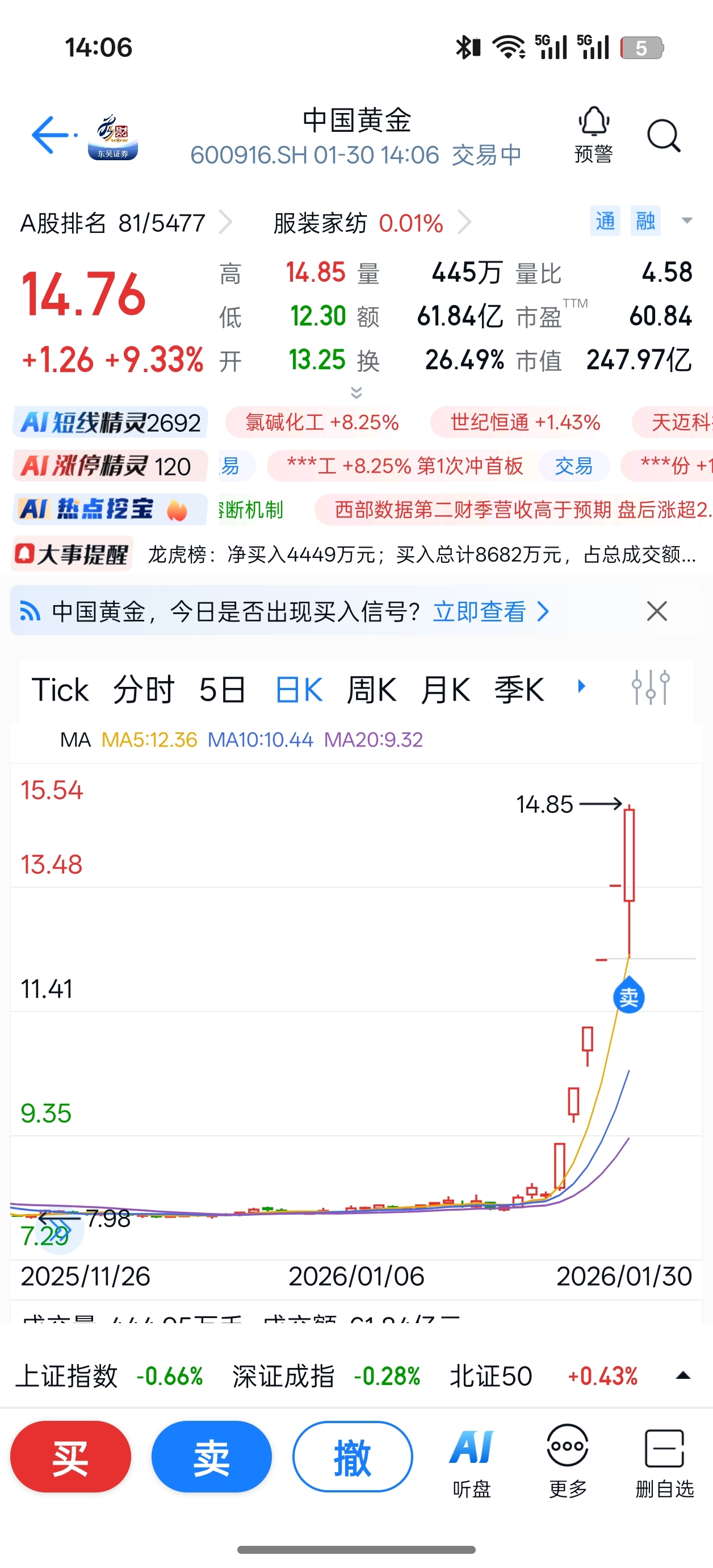 14.7卖了收益60%不敢拿了。留下的发财