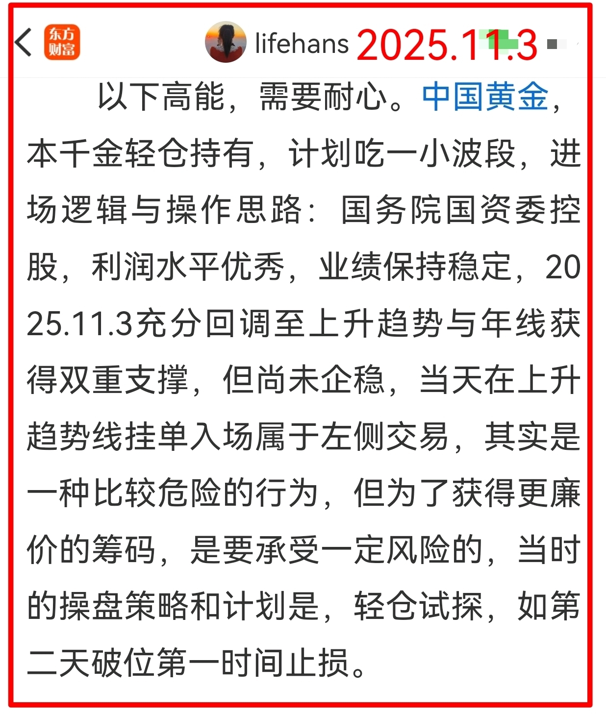 平常我们往往只看到别人的高光时刻,却不知她在底部独自熬过了多少寂寞崩溃的日夜,悲痛欲绝,痛哭流涕,不被理解。中国黄金五连板,最先分享于2025.11.3《主力与技术派的恩怨情仇》,截图为基本面和技术面简单概括操作思路逻辑。