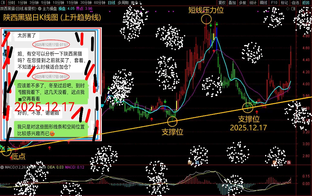 陕西黑猫,最先提示关注是去年11月份评论区,不找截图了,当时提示亲们在年线和上升趋势线双重支撑处守株待兔。这不,2025.12.17机会来了,看画中画和一位亲在微风送忍受论贪婪与恐惧,潜伏与煎熬,幸运的是得到不少亲的认可与理解。