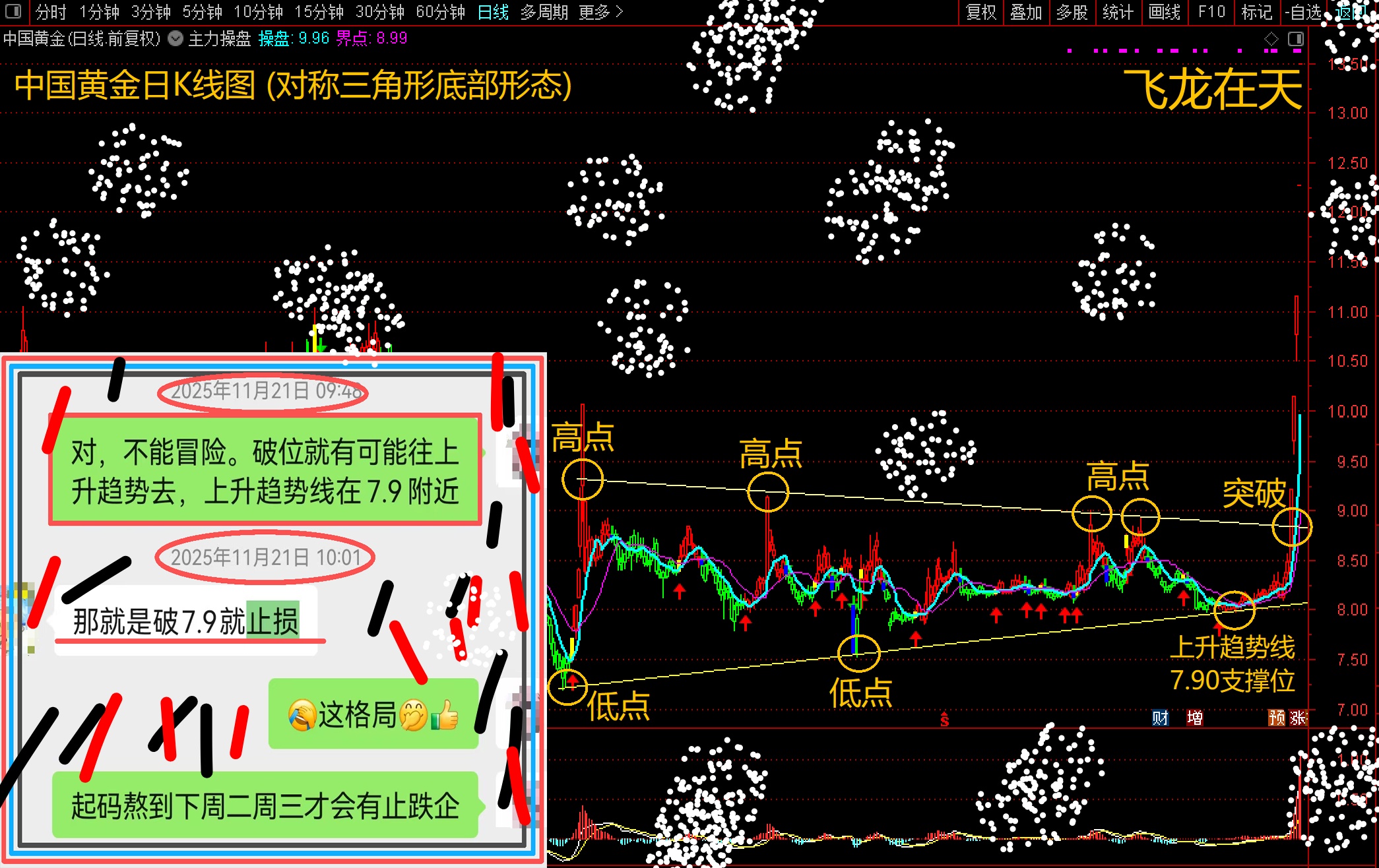 如今飞龙在天五连板,又有谁知道早在7.90支撑位时,我和亲们在微风送信压抑着内心憋屈。看画中画,当时微风送信让一位亲憋在上升趋势线支撑位7.9附近潜伏。截图涂鸦视觉疲劳,亲们将就着看。