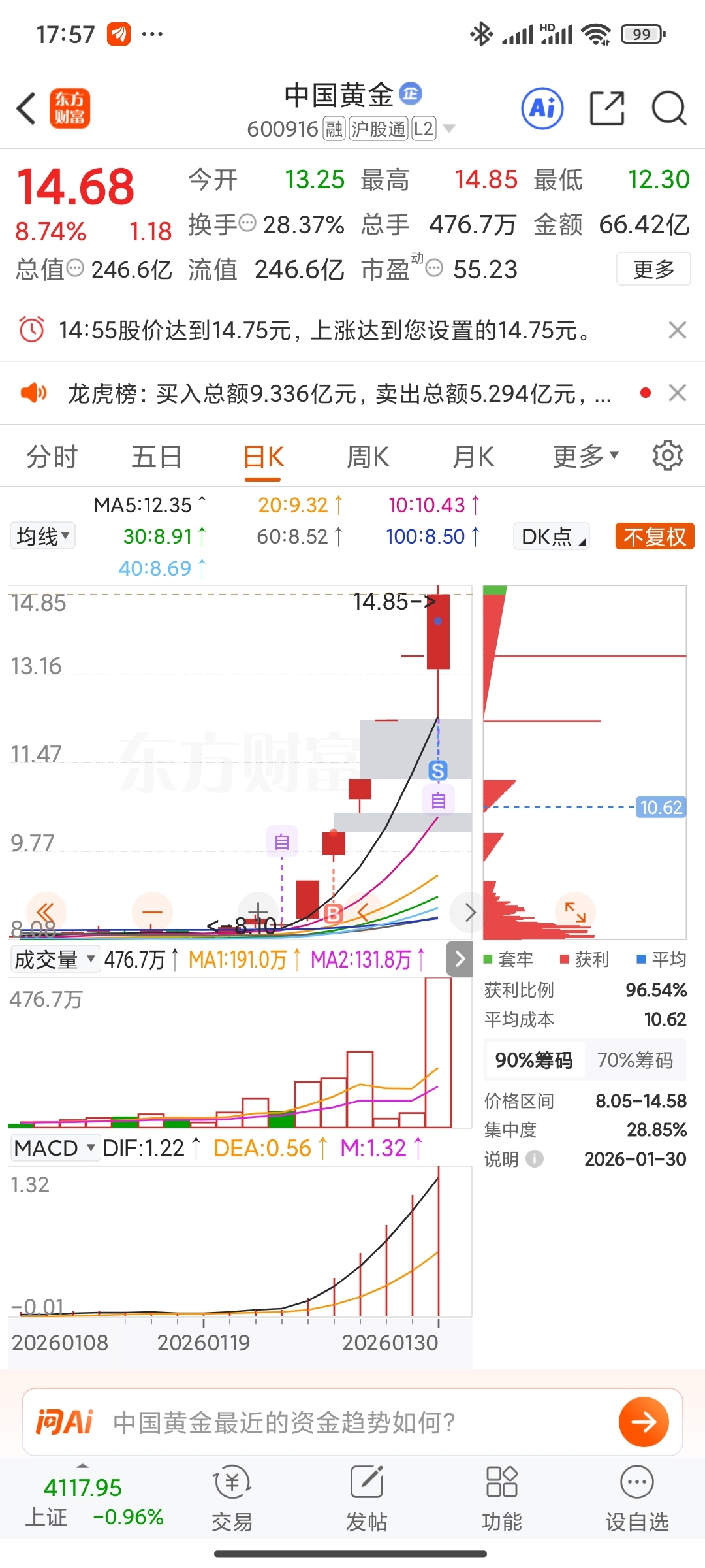$中国黄金(SH600916)$ 头一次打板,不足一成仓位,也蛮愉快。打板是因为前一天没看到提醒价的消息,否则很少会有打板这么高风险的行为……因为重仓了AI,所以今天-8个点没钱补仓